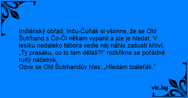 Indiánský obřad. Inču-Čuňák si všimne, že se Old Šutrhand s Čo-Či někam vypařili a jde je hledat. V lesíku nedaleko tábora vedle něj náhle zašustí křoví.
