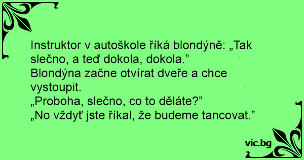 Instruktor v autoškole říká blondýně: „Tak slečno, a teď dokola, dokola.”