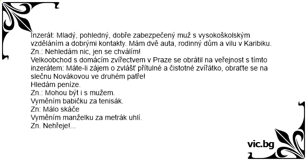 Inzerát: Mladý, pohledný, dobře zabezpečený muž s vysokoškolským vzděláním a dobrými kontakty. Mám dvě auta, rodinný dům a vilu v Karibiku.