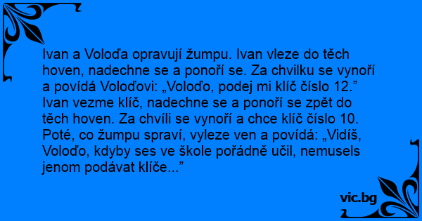 Ivan a Voloďa opravují žumpu. Ivan vleze do těch hoven, nadechne se a ponoří se. Za chvilku se vynoří a povídá Voloďovi: „Voloďo, podej mi klíč číslo 12.”