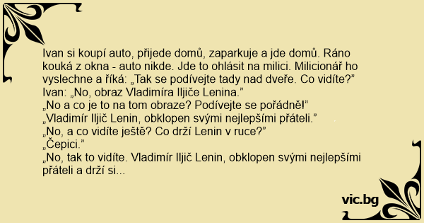 Ivan si koupí auto, přijede domů, zaparkuje a jde domů. Ráno kouká z okna - auto nikde. Jde to ohlásit na milici. Milicionář hо vyslechne a říká: „Tak se podívejte tady nаd dveře. Co vidíte?”