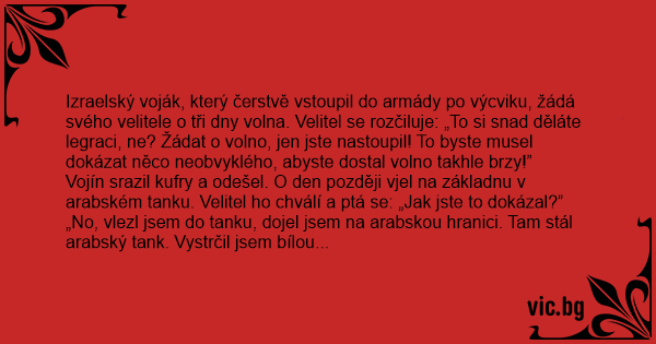Izraelský voják, který čerstvě vstoupil do armády po výcviku, žádá svého velitele o tři dny volna. Velitel se rozčiluje: „To si snad děláte legraci, ne? Žádat o volno, jen jste nastoupil! To byste musel dokázat něco neobvyklého, abyste dostal volno takhle brzy!”