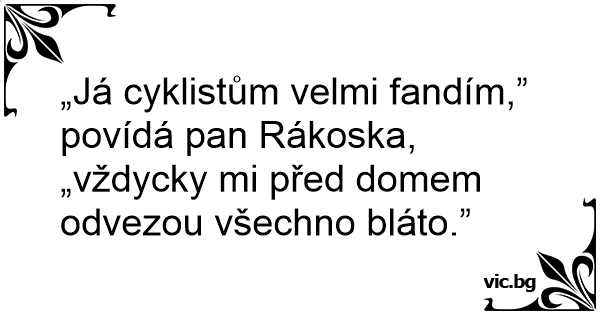 „Já cyklistům velmi fandím,” povídá pan Rákoska, „vždycky mi před domem odvezou všechno bláto.”