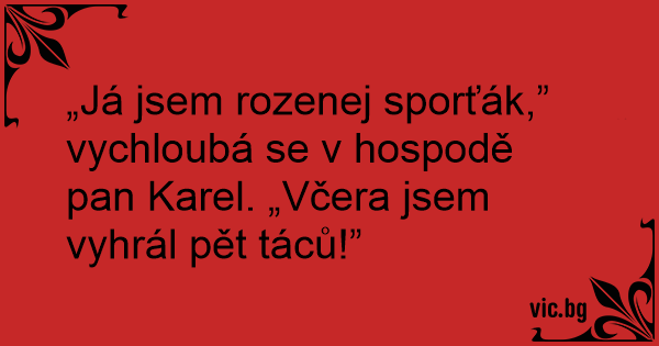 „Já jsem rozenej sporťák,” vychloubá se v hospodě pan Karel. „Včera jsem vyhrál pět táců!”