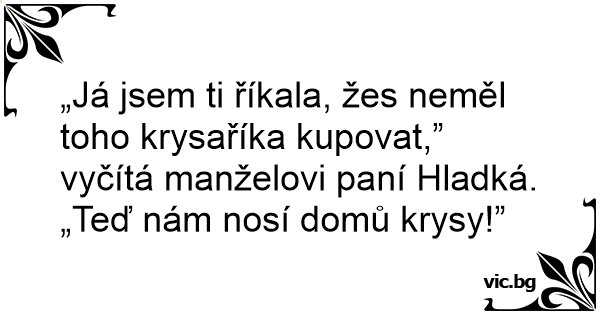 „Já jsem ti říkala, žes neměl toho krysaříka kupovat,” vyčítá manželovi paní Hladká. „Teď nám nosí domů krysy!”