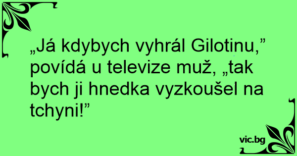 „Já kdybych vyhrál Gilotinu,” povídá u televize muž, „tak bych ji hnedka vyzkoušel na tchyni!”