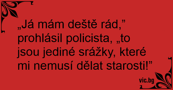 „Já mám deště rád,” prohlásil policista, „to jsou jediné srážky, které mi nemusí dělat starosti!”