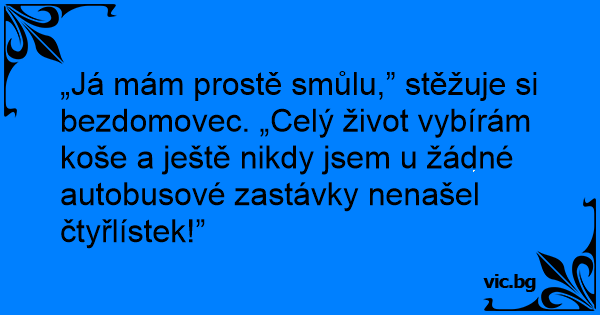 „Já mám prostě smůlu,” stěžuje si bezdomovec. „Celý život vybírám koše a ještě nikdy jsem u žádné autobusové zastávky nenašel čtyřlístek!”