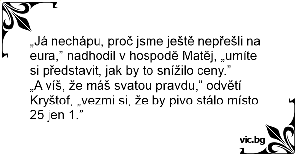 „Já nechápu, proč jsme ještě nepřešli na eura,” nadhodil v hospodě Matěj, „umíte si představit, jak by to snížilo ceny.”