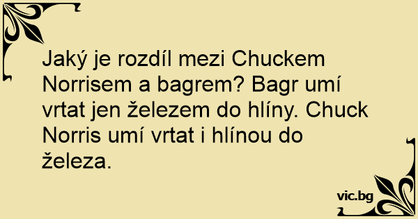 Jaký je rozdíl mezi Chuckem Norrisem a bagrem? Bagr umí vrtat jen železem do hlíny. Chuck Norris umí vrtat i hlínou do železa.