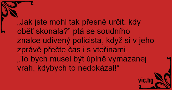 „Jak jste mohl tak přesně určit, kdy oběť skonala?” ptá se soudního znalce udivený policista, když si v jeho zprávě přečte čas i s vteřinami.