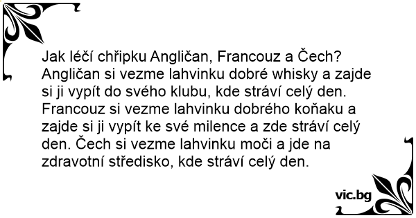 Angličan si vezme lahvinku dobré whisky a zajde si ji vypít do svého klubu, kde stráví celý den. Francouz si vezme lahvinku dobrého koňaku a zajde si ji vypít ke své milence a zde stráví celý den. Čech si vezme lahvinku moči a jde na zdravotní středisko, kde stráví celý den.