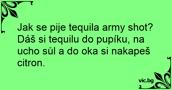Dáš si tequilu do pupíku, na ucho sůl a do oka si nakapeš citron.