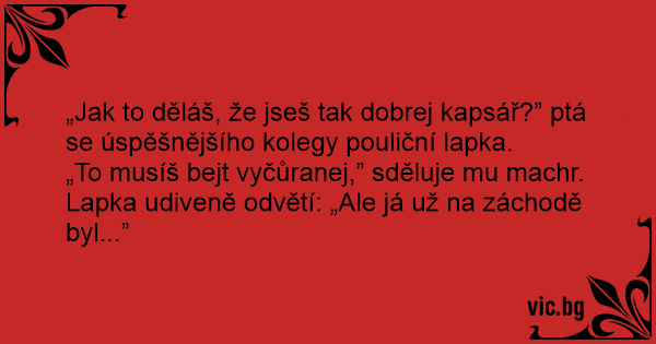 „Jak to děláš, že jseš tak dobrej kapsář?” ptá se úspěšnějšího kolegy pouliční lapka.