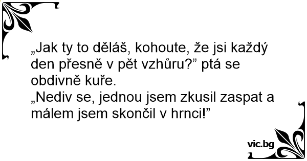 „Jak ty to děláš, kohoute, že jsi každý den přesně v pět vzhůru?” ptá se obdivně kuře.