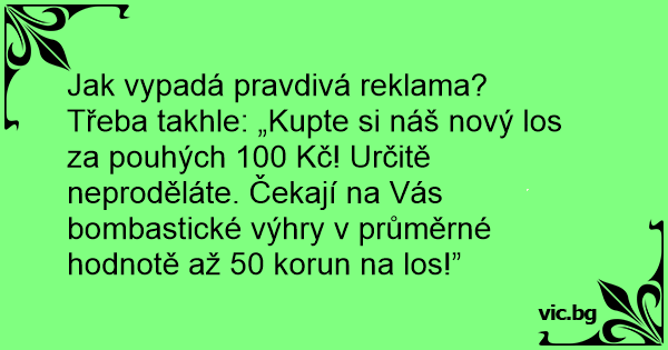 Třeba takhle: „Kupte si náš nový los za pouhých 100 Kč! Určitě neproděláte. Čekají na Vás bombastické výhry v průměrné hodnotě až 50 korun na los!”
