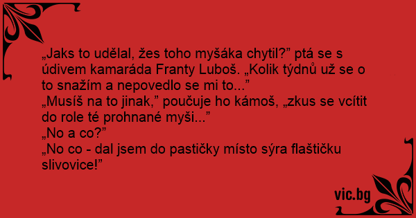 „Jaks to udělal, žes toho myšáka chytil?” ptá se s údivem kamaráda Franty Luboš. „Kolik týdnů už se o to snažím a nepovedlo se mi to...”
