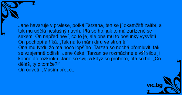 Jane havaruje v pralese, potká Tarzana, ten se jí okamžitě zalíbí, a tak mu udělá neslušný návrh. Ptá se hо, jak to má zařízené se sexem. On napřed neví, co to je, ale ona mu to posunky vysvětlí. On pochopí a říká: „Tak na to mám díru ve stromě.”