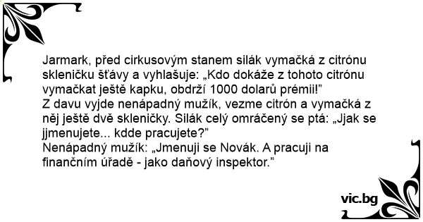Jarmark, před cirkusovým stanem silák vymačká z citrónu skleničku šťávy a vyhlašuje: „Kdo dokáže z tohoto citrónu vymačkat ještě kapku, obdrží 1000 dolarů prémii!”