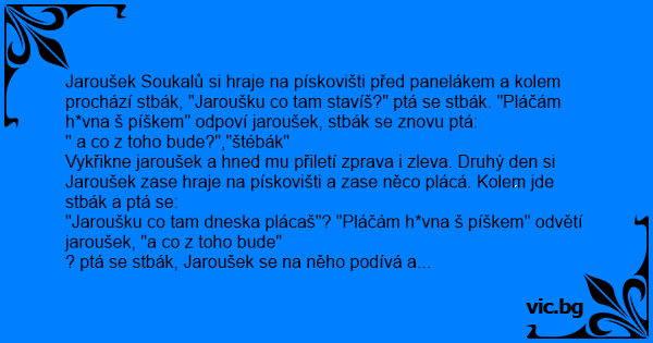 Jaroušek Soukalů si hraje na pískovišti před panelákem a kolem prochází stbák, "Jaroušku co tam stavíš?" ptá se stbák. "Pláčám h*vna š píškem" odpoví jaroušek, stbák se znovu ptá: