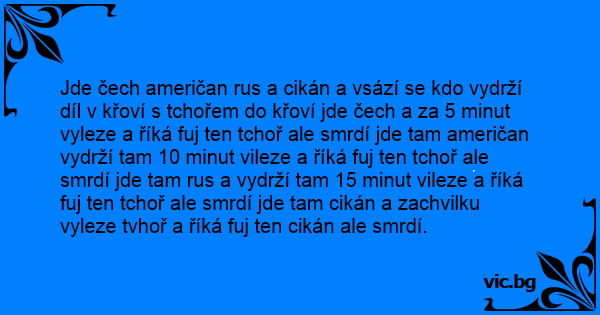 Jde čech američan rus a cikán a vsází se kdo vydrží díl v křoví s tchořem do křoví jde čech a za 5 minut vyleze a říká fuj ten tchoř ale smrdí jde tam američan vydrží tam 10 minut vileze a říká fuj ten tchoř ale smrdí jde tam rus a vydrží tam 15 minut vileze a říká fuj ten tchoř ale smrdí jde tam cikán a zachvilku vyleze tvhoř a říká fuj ten cikán ale smrdí.