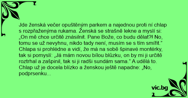 Jde ženská večer opuštěným parkem a najednou proti ní chlap s rozpřaženýma rukama. Ženská se strašně lekne a myslí si: „On mě chce určitě znásilnit. Pane Bože, co budu dělat?! No, tomu se už nevyhnu, nikdo tady není, musím se s tím smířit.”