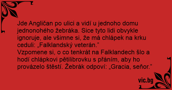 Jde Angličan po ulici a vidí u jednoho domu jednonohého žebráka. Sice tyto lidi obvykle ignoruje, ale všimne si, že má chlápek na krku ceduli: „Falklandský veterán.”