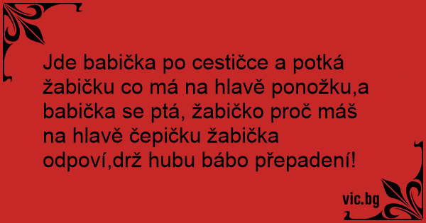 Jde babička po cestičce a potká žabičku co má na hlavě ponožku,a babička se ptá, žabičko proč máš na hlavě čepičku žabička odpoví,drž hubu bábo přepadení!
