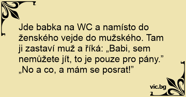 Jde babka na WC a namísto do ženského vejde do mužského. Tam ji zastaví muž a říká: „Babi, sem nemůžete jít, to je pouze pro pány.”