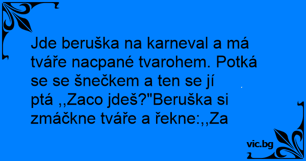 Jde beruška na karneval a má tváře nacpané tvarohem. Potká se se šnečkem a ten se jí ptá ,,Zaco jdeš?"Beruška si zmáčkne tváře a řekne:,,Za beďara!"