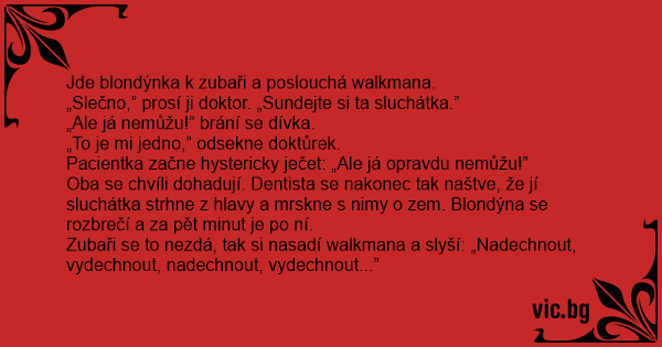 Jde blondýnka k zubaři a poslouchá walkmana.