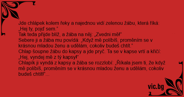 Jde chlápek kolem řeky a najednou vidí zelenou žábu, která říká: „Hej ty, pojď sem.”