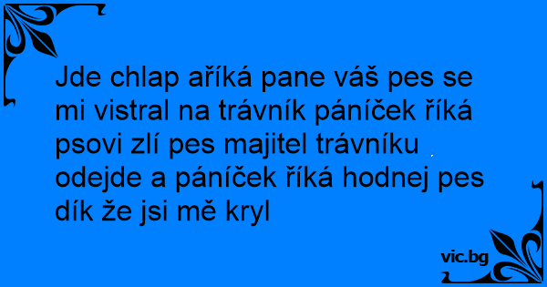 Jde chlap aříká pane váš pes se mi vistral na trávník páníček říká psovi zlí pes majitel trávníku odejde a páníček říká hodnej pes dík že jsi mě kryl