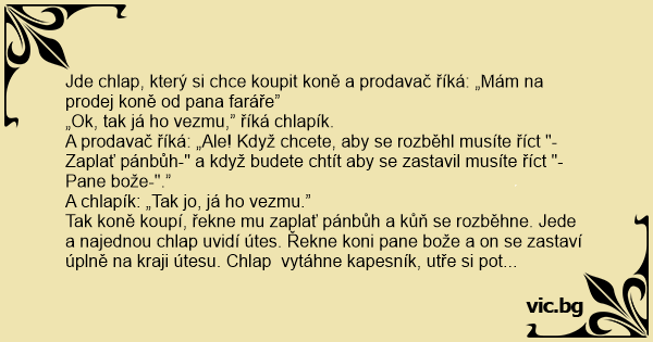 Tak koně koupí, řekne mu zaplať pánbůh a kůň se rozběhne. Jede a najednou chlap uvidí útes. Řekne koni pane bože a on se zastaví úplně na kraji útesu. Chlap vytáhne kapesník, utře si рот z čela a říká: „zaplať pánbůh.”