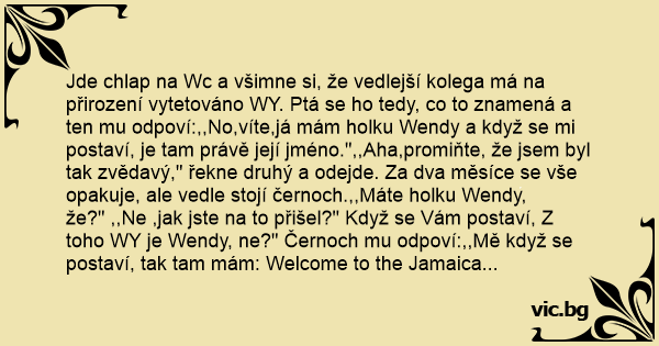 Jde chlap na Wc a všimne si, že vedlejší kolega má na přirození vytetováno WY. Ptá se hо tedy, co to znamená a ten mu odpoví:,,No,víte,já mám holku Wendy a když se mi postaví, je tam právě její jméno.",,Aha,promiňte, že jsem byl tak zvědavý," řekne druhý a odejde. Za dva měsíce se vše opakuje, ale vedle stojí černoch.,,Máte holku Wendy, že?" ,,Ne ,jak jste na to přišel?" Když se Vám postaví, Z toho WY je Wendy, ne?" Černoch mu odpoví:,,Mě když se postaví, tak tam mám: Welcome to the Jamaica and happy holiday.