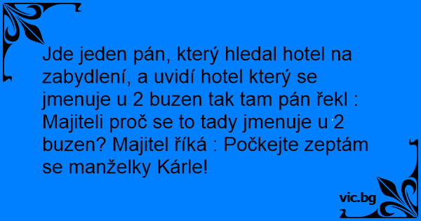 Jde jeden pán, který hledal hotel na zabydlení, a uvidí hotel který se jmenuje u 2 buzen tak tam pán řekl : Majiteli proč se to tady jmenuje u 2 buzen? Majitel říká : Počkejte zeptám se manželky Kárle!