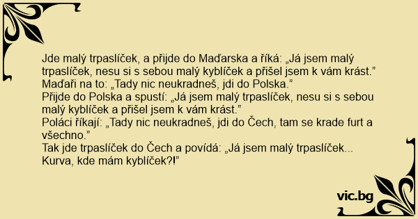 Jde malý trpaslíček, a přijde do Maďarska a říká: „Já jsem malý trpaslíček, nesu si s sebou malý kyblíček a přišel jsem k vám krást.”