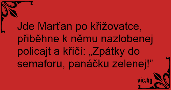 Jde Marťan po křižovatce, přiběhne k němu nazlobenej policajt a křičí: „Zpátky do semaforu, panáčku zelenej!”