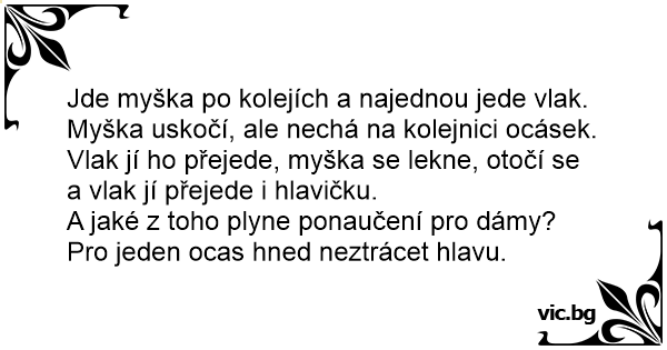 Jde myška po kolejích a najednou jede vlak. Myška uskočí, ale nechá na kolejnici ocásek. Vlak jí hо přejede, myška se lekne, otočí se a vlak jí přejede i hlavičku.