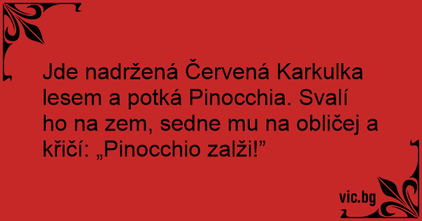 Jde nadržená Červená Karkulka lesem a potká Pinocchia. Svalí hо na zem, sedne mu na obličej a křičí: „Pinocchio zalži!”