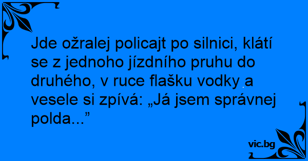 Jde ožralej policajt po silnici, klátí se z jednoho jízdního pruhu do druhého, v ruce flašku vodky a vesele si zpívá: „Já jsem správnej polda...”