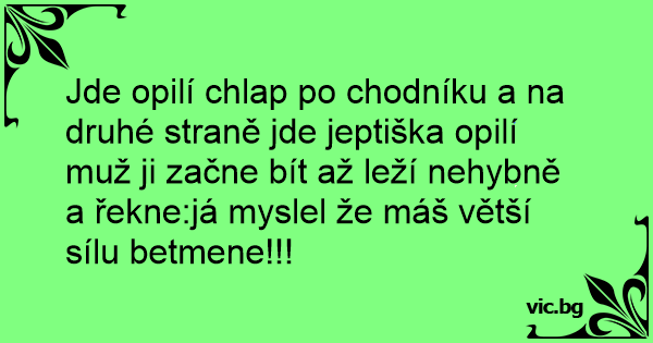 Jde opilí chlap po chodníku a na druhé straně jde jeptiška opilí muž ji začne bít až leží nehybně a řekne:já myslel že máš větší sílu betmene!!!