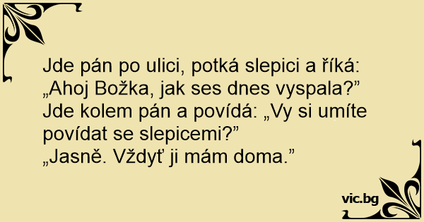 Jde pán po ulici, potká slepici a říká: „Ahoj Božka, jak ses dnes vyspala?”