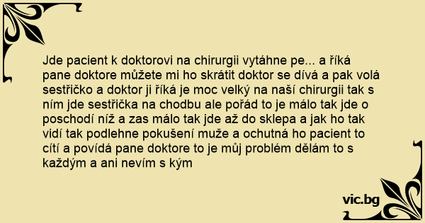 Jde pacient k doktorovi na chirurgii vytáhne pe... a říká pane doktore můžete mi hо skrátit doktor se dívá a pak volá sestřičko a doktor ji říká je moc velký na naší chirurgii tak s ním jde sestřička na chodbu ale pořád to je málo tak jde o poschodí níž a zas málo tak jde až do sklepa a jak hо tak vidí tak podlehne pokušení muže a ochutná hо pacient to cítí a povídá pane doktore to je můj problém dělám to s každým a ani nevím s kým