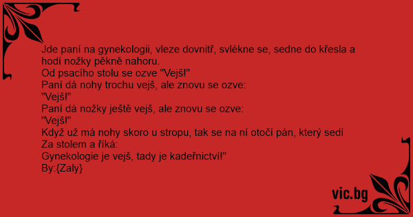 Jde paní na gynekologii, vleze dovnitř, svlékne se, sedne do křesla a hodí nožky pěkně nahoru.