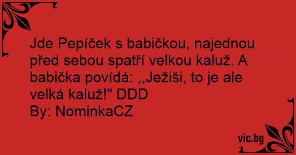 Jde Pepíček s babičkou, najednou před sebou spatří velkou kaluž. A babička povídá: ,,Ježiši, to je ale velká kaluž!" DDD