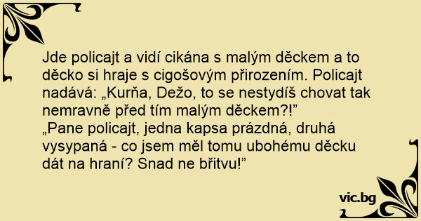 Jde policajt a vidí cikána s malým děckem a to děcko si hraje s cigošovým přirozením. Policajt nadává: „Kurňa, Dežo, to se nestydíš chovat tak nemravně před tím malým děckem?!”