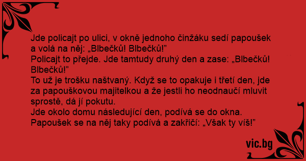 Jde policajt po ulici, v okně jednoho činžáku sedí papoušek a volá na něj: „Blbečků! Blbečků!”