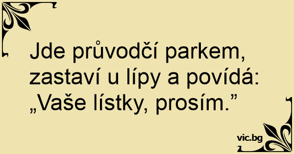 Jde průvodčí parkem, zastaví u lípy a povídá: „Vaše lístky, prosím.”