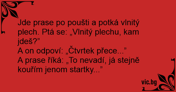 Jde prase po poušti a potká vlnitý plech. Ptá se: „Vlnitý plechu, kam jdeš?”